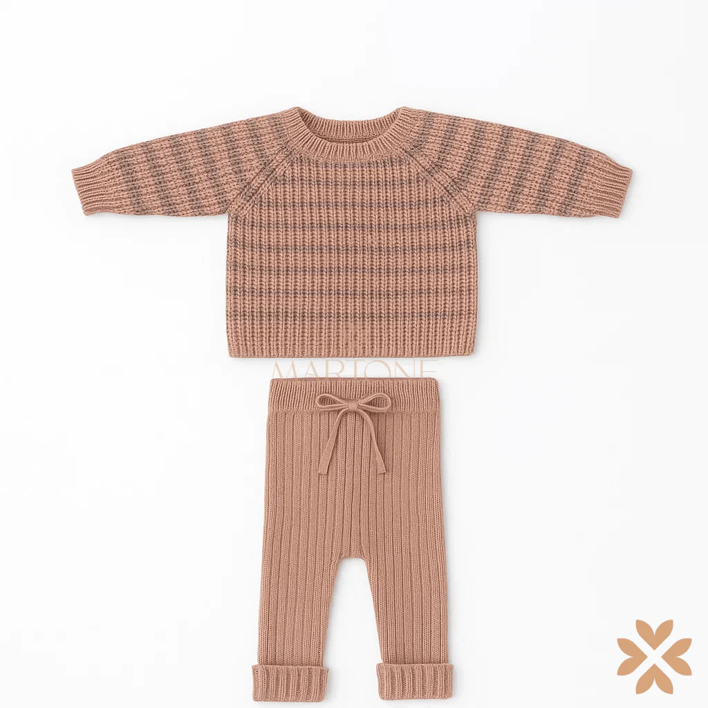 Completo neonata in maglia rosa con motivo a righe. Maglioncino a girocollo con maniche lunghe e polsini a costine, pantalone coordinato con risvolto e vita elasticata. Realizzato in filato morbido per garantire comfort e libertà di movimento.