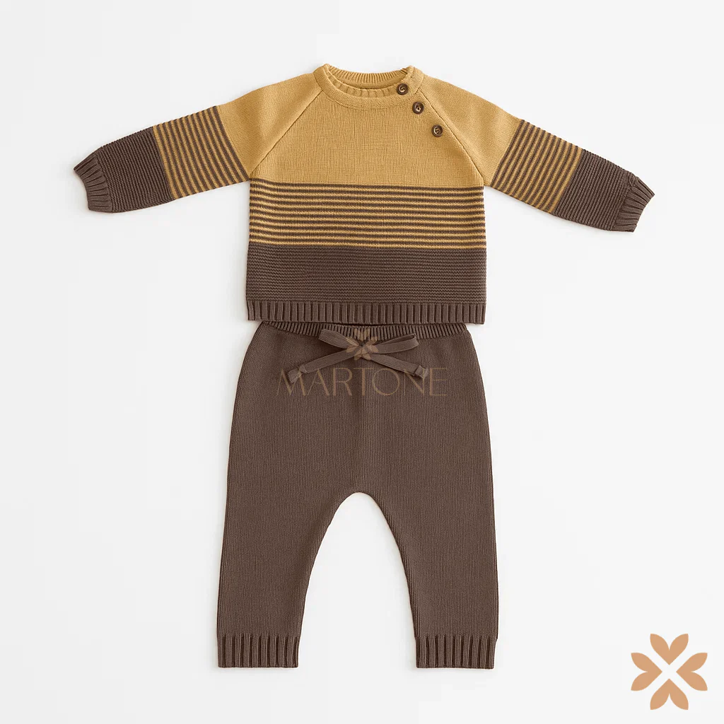 Tutina in misto lana per neonato composto da maglia a manica lunga con bottoni laterali sullo scollo e motivo a righe tono su tono. Pantalone coordinato con coulisse in vita, pratico e confortevole, ideale per un outfit caldo ed elegante.