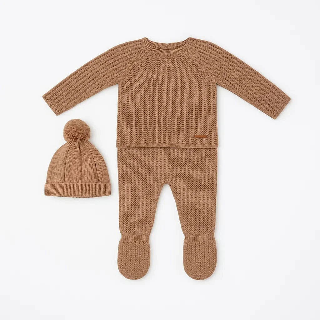Tutina spezzata in misto lana per neonato con ghettine e cuffia coordinata, realizzata con trama lavorata all’uncinetto.