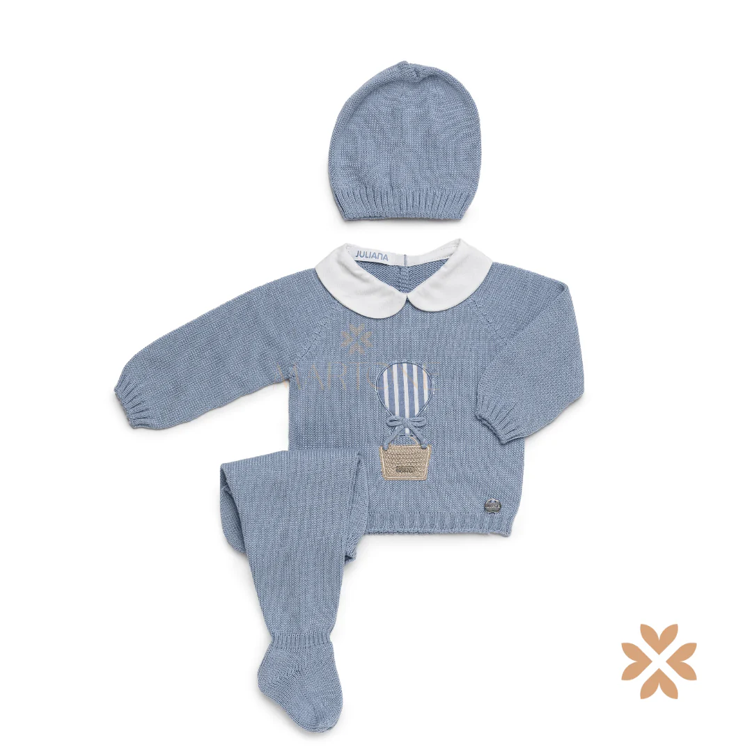 Tutina in filio di cotone composta da maglia con colletto bianco, abbottonatura sul retro e dettaglio frontale, ghettine e cuffia coordinata