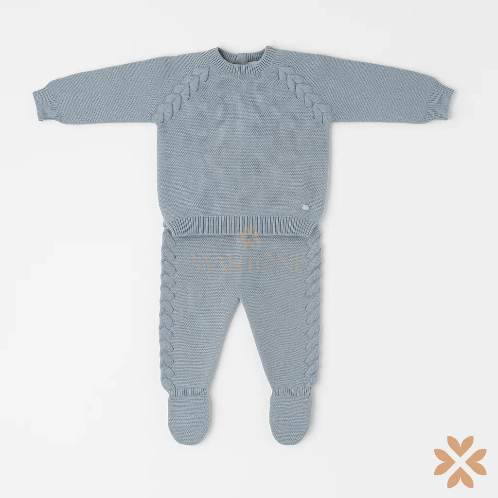 Tutina spezzata in maglia composto da maglia a maniche lunghe con lavorazione intrecciata sulle spalle e pantalone con piedini e stesso motivo lungo i lati.