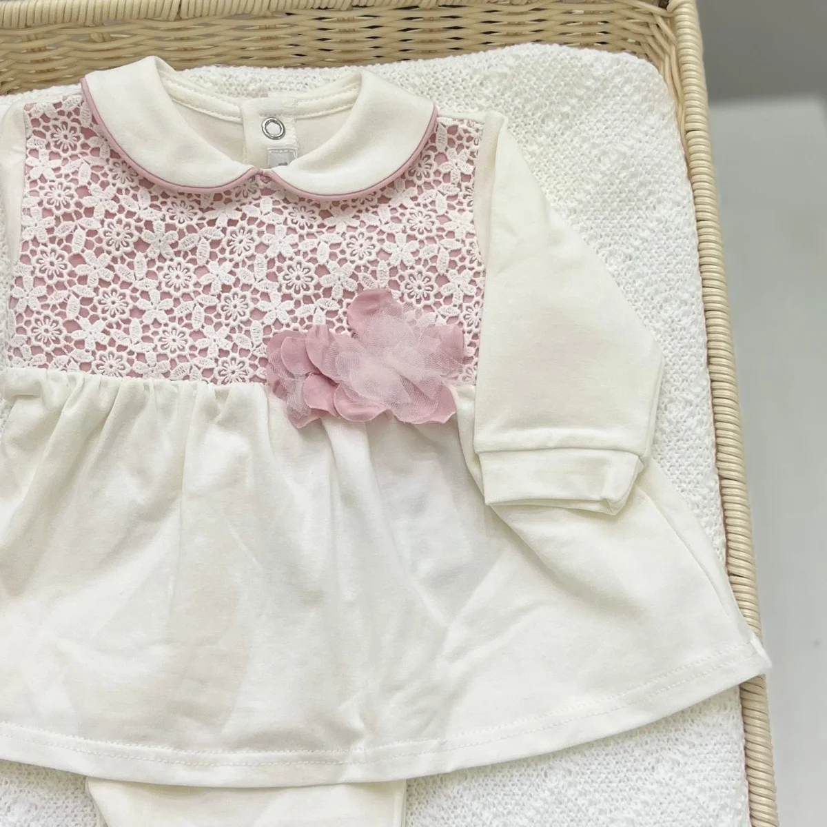 Tutina spezzata in cotone jersey per neonata, morbida e confortevole. Il dettaglio in macramè aggiunge un tocco di raffinatezza, rendendola ideale per le occasioni speciali senza rinunciare alla praticità.