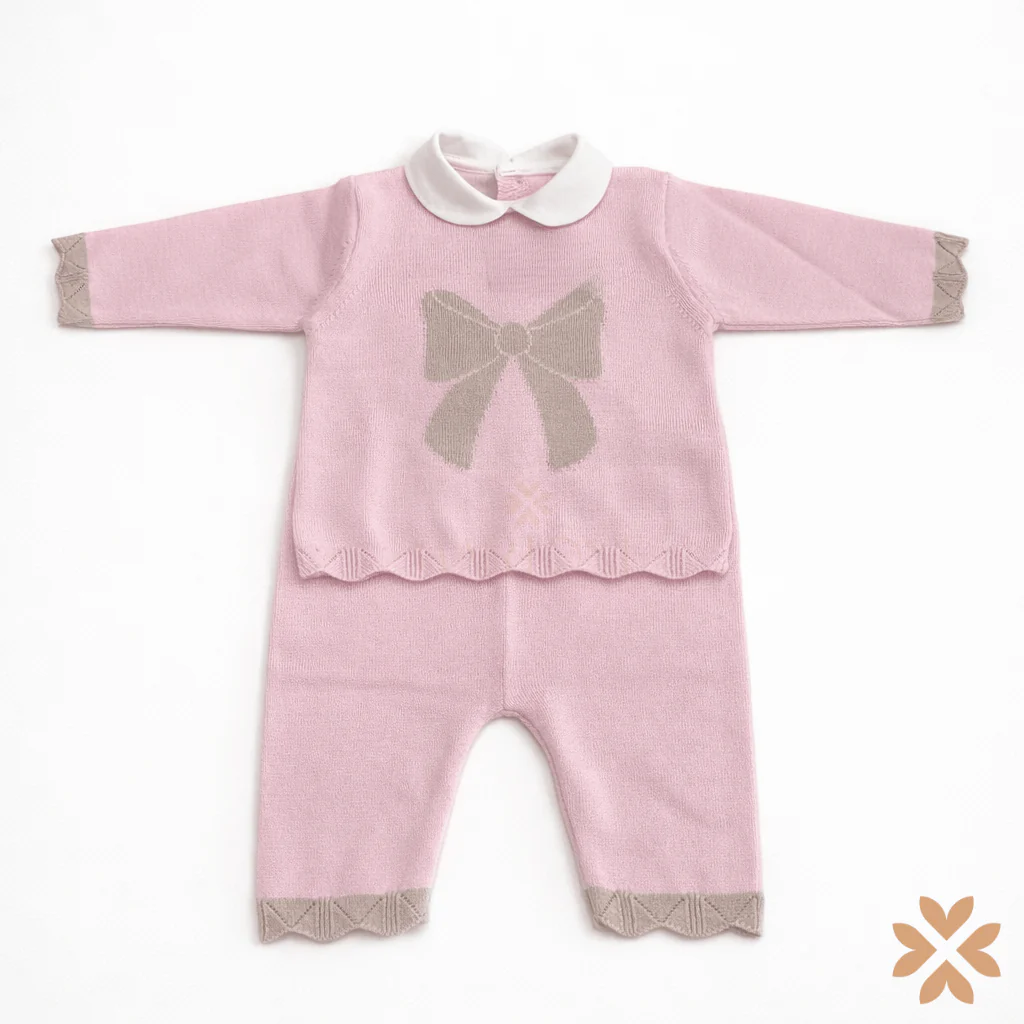 Tutina spezzata in filo di cotone con fiocco beige e bordi a contrasto, chiusura sul retro.