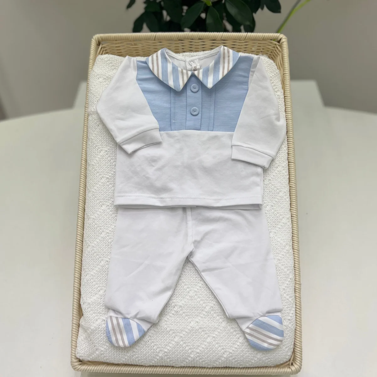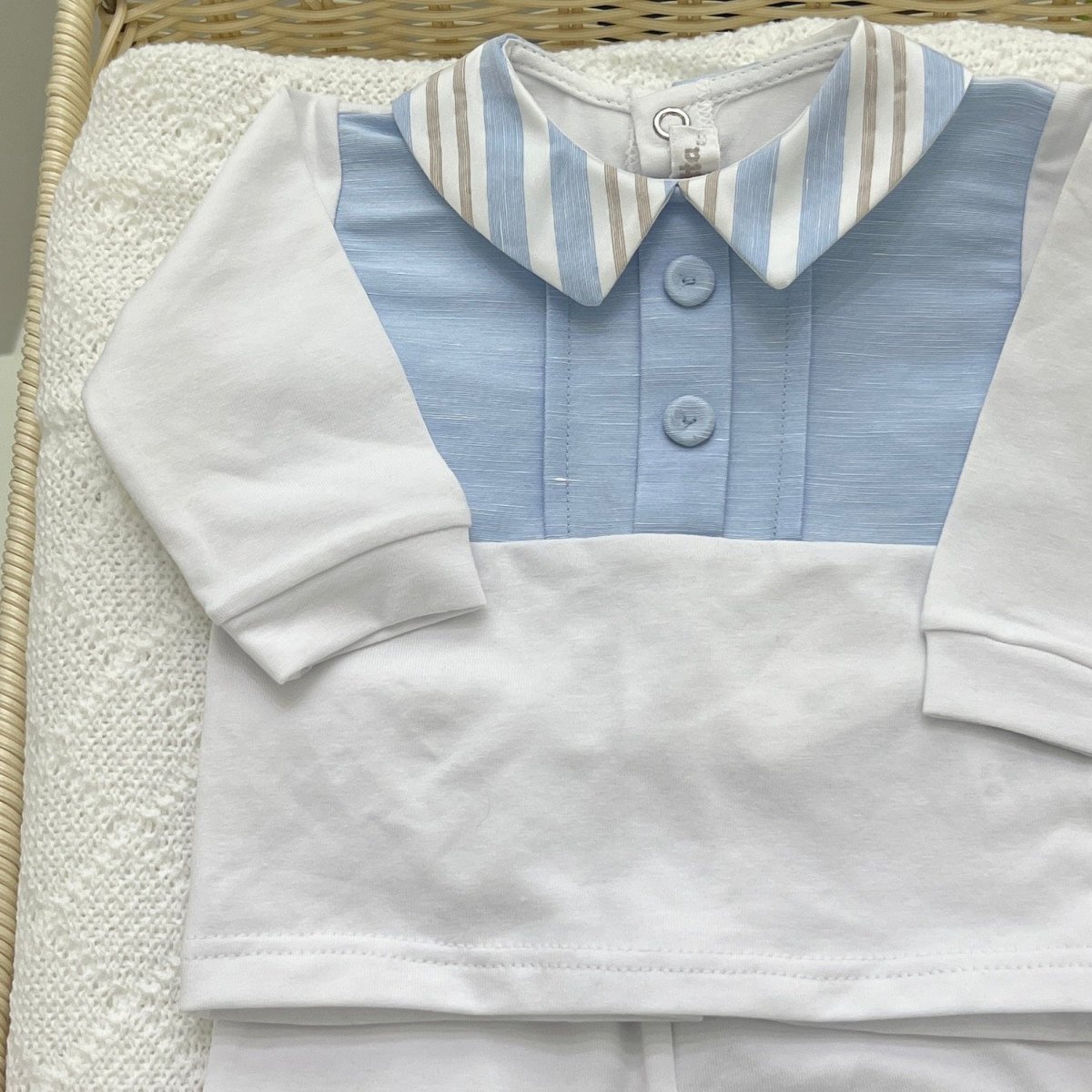 Questa tutina spezzata in cotone jersey combina comfort e raffinatezza grazie al suo dettaglio celeste e alla delicata fantasia a righe. Morbida e avvolgente, è ideale per i primi mesi del neonato, offrendo praticità senza rinunciare allo stile.