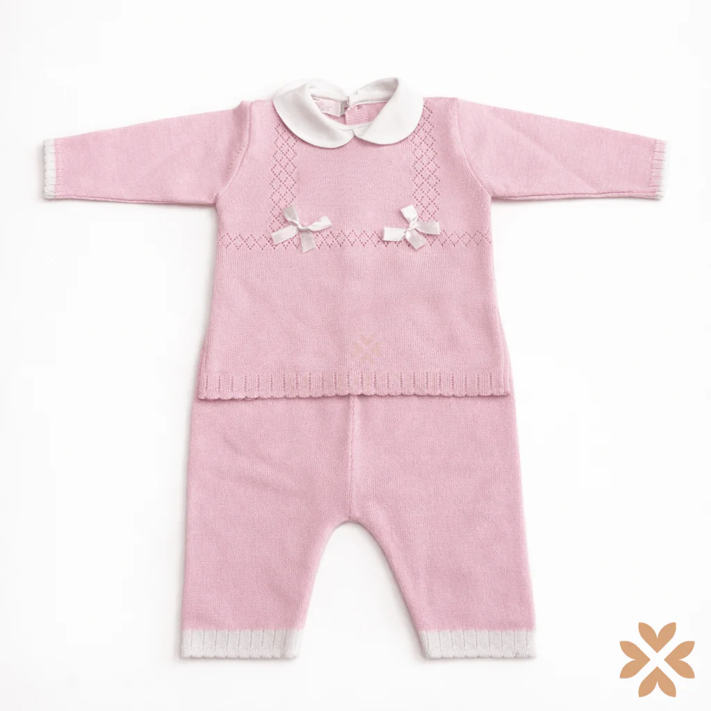 Tutina spezzata in filo di cotone con trafori e fiocchetti, colletto bianco e bordi a contrasto.