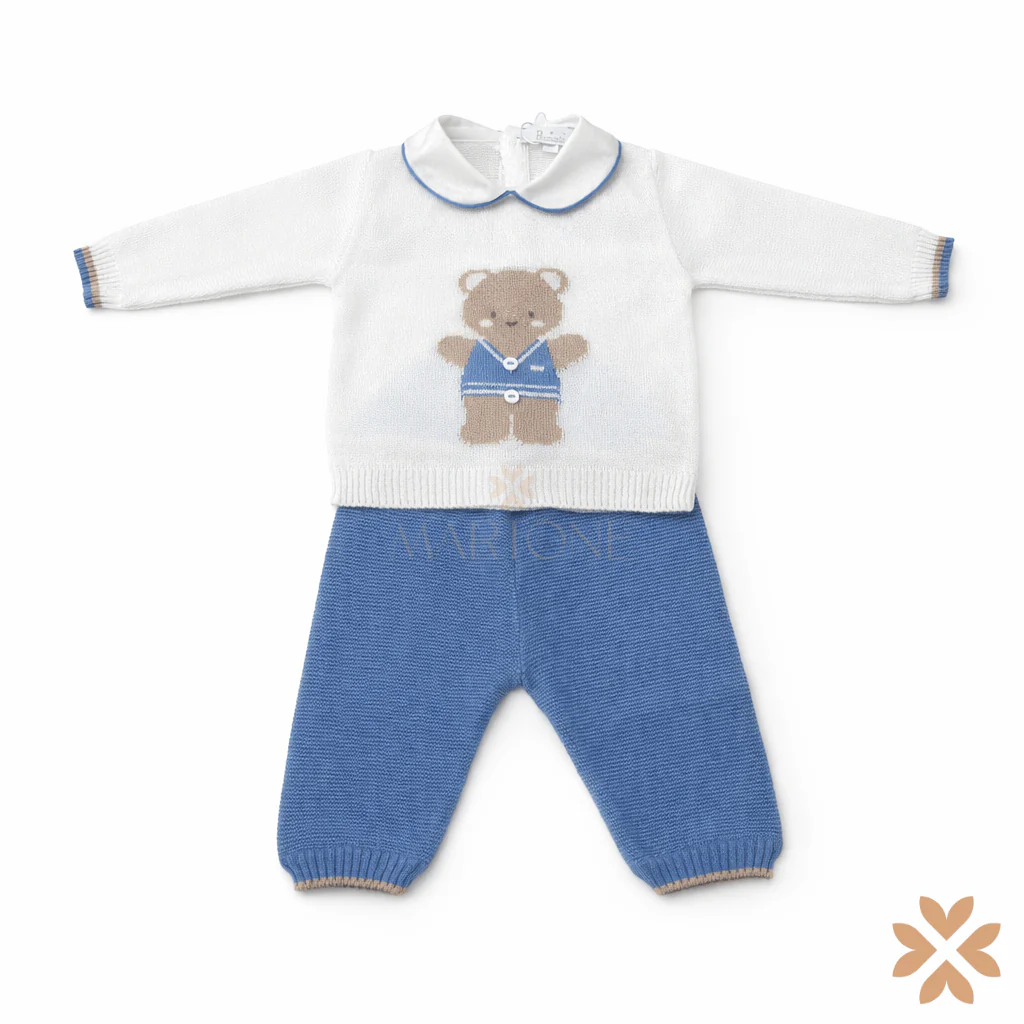 Completo due pezzi in 100% filo di cotone, formato da maglia con colletto e delicato orsetto decorativo, abbinata a pantalone corto coordinato. Una proposta curata e armoniosa, pensata per battesimi e momenti importanti