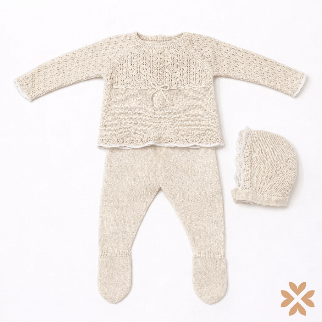 Completo due pezzi in filo di cotone composto da maglia con lavorazione traforata su maniche e parte superiore, arricchita da fiocco centrale. Ghettina coordinata con piedini. Cuffietta inclusa. Chiusura con bottoni sul retro.
