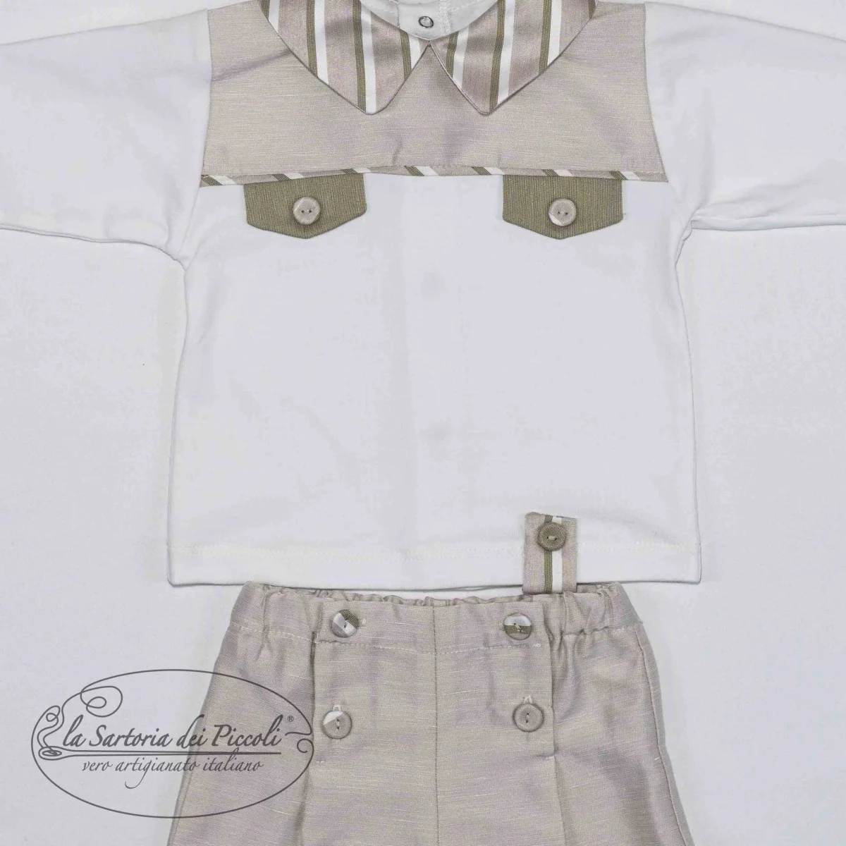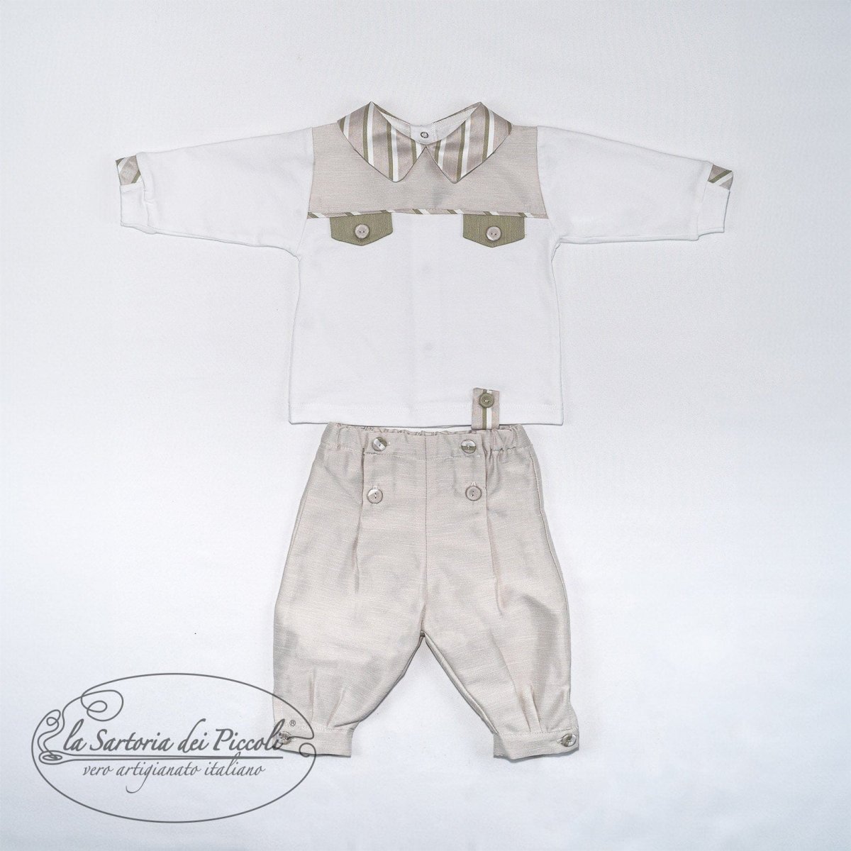 Tutina spezzata in cotone e shantung, con dettagli a righe. Un completo raffinato e versatile, perfetto per le prime occasioni speciali.