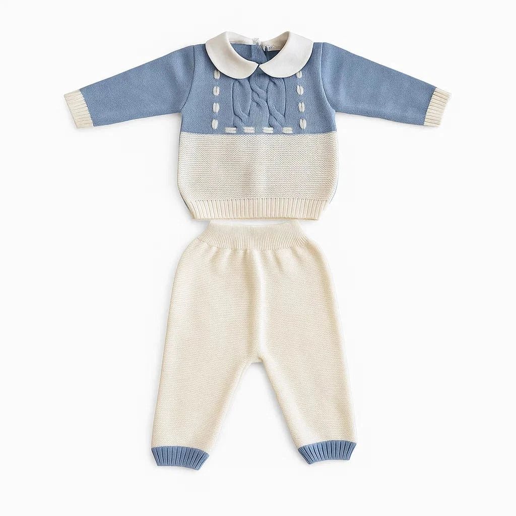 Tutina spezzata in pura lana, con maglia intrecciata e passanastro in vita abbinata a pantalone coordinato. Calda, morbida e facile da indossare, con chiusura sul retro della maglia.