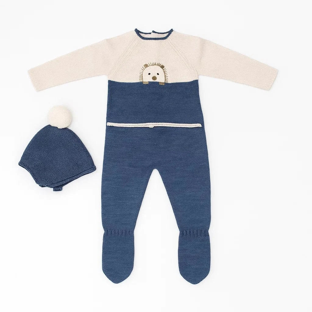 Tutina in misto lana per neonato nei colori panna e blu a contrasto, con ghettine e cuffia coordinata, decorata da un ricamo con un dolce riccio