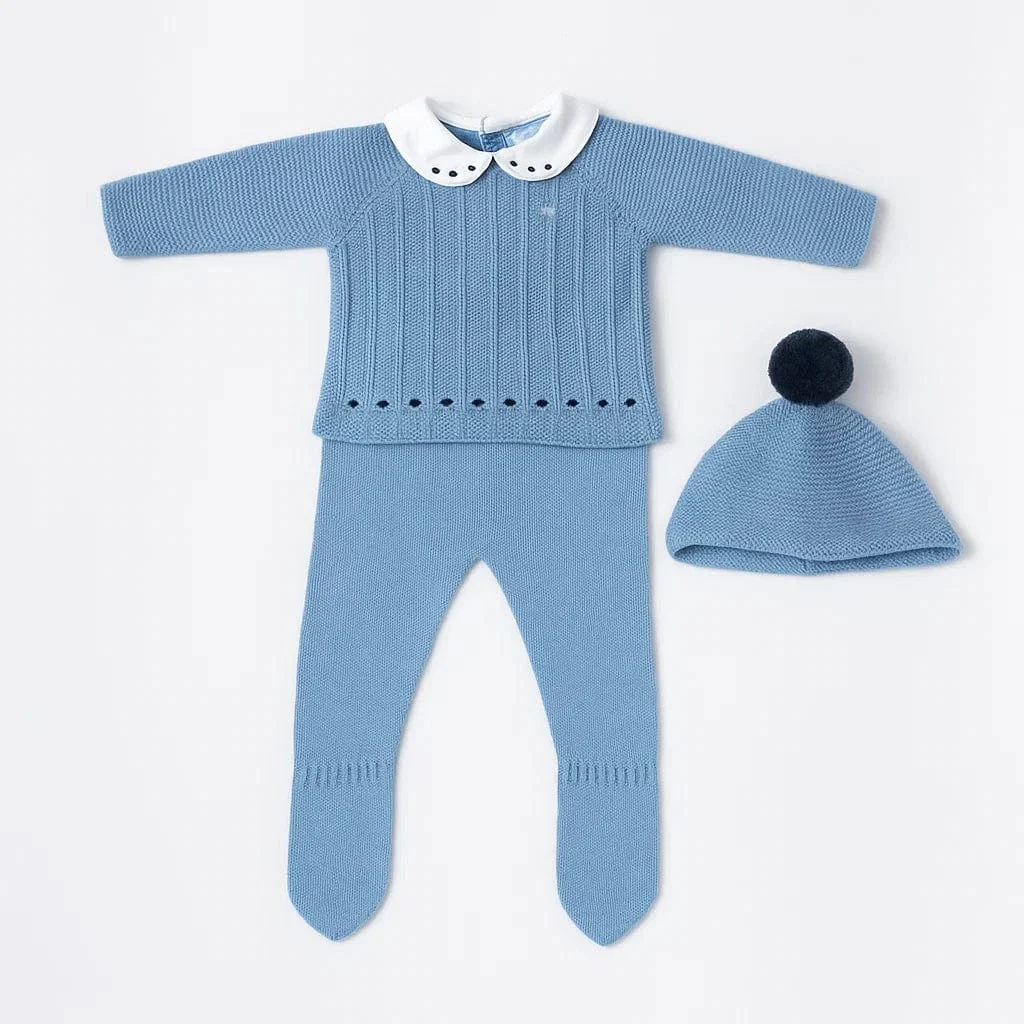 Tutina spezzata in misto lana celeste per neonato, completa di maglia con colletto rifinita da trama a trecce in rilievo, ghettine abbinate e cappellino coordinato con pompon.