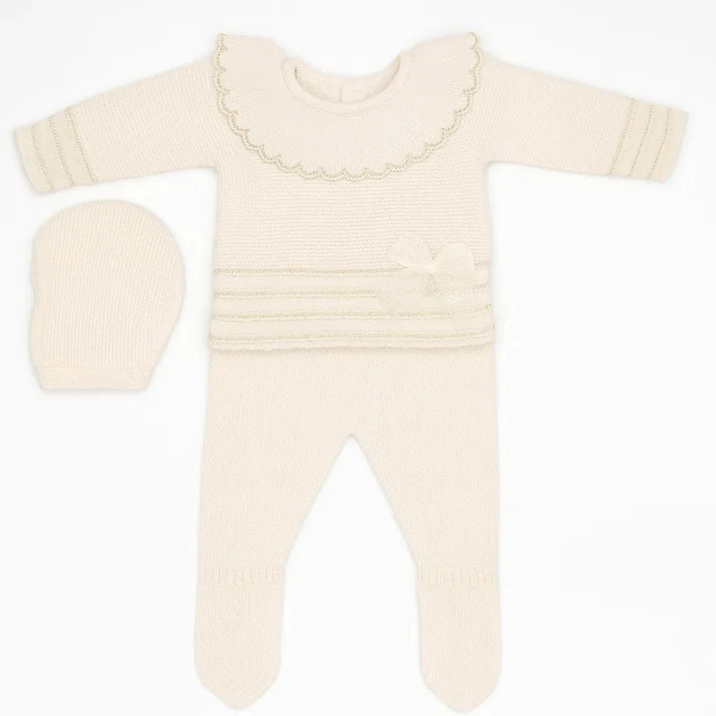 Tutina spezzata in misto lana per neonata con ghettine e cuffia coordinata, maglia rifinita con bordi in ecofur e fiocco in tulle glitterato.