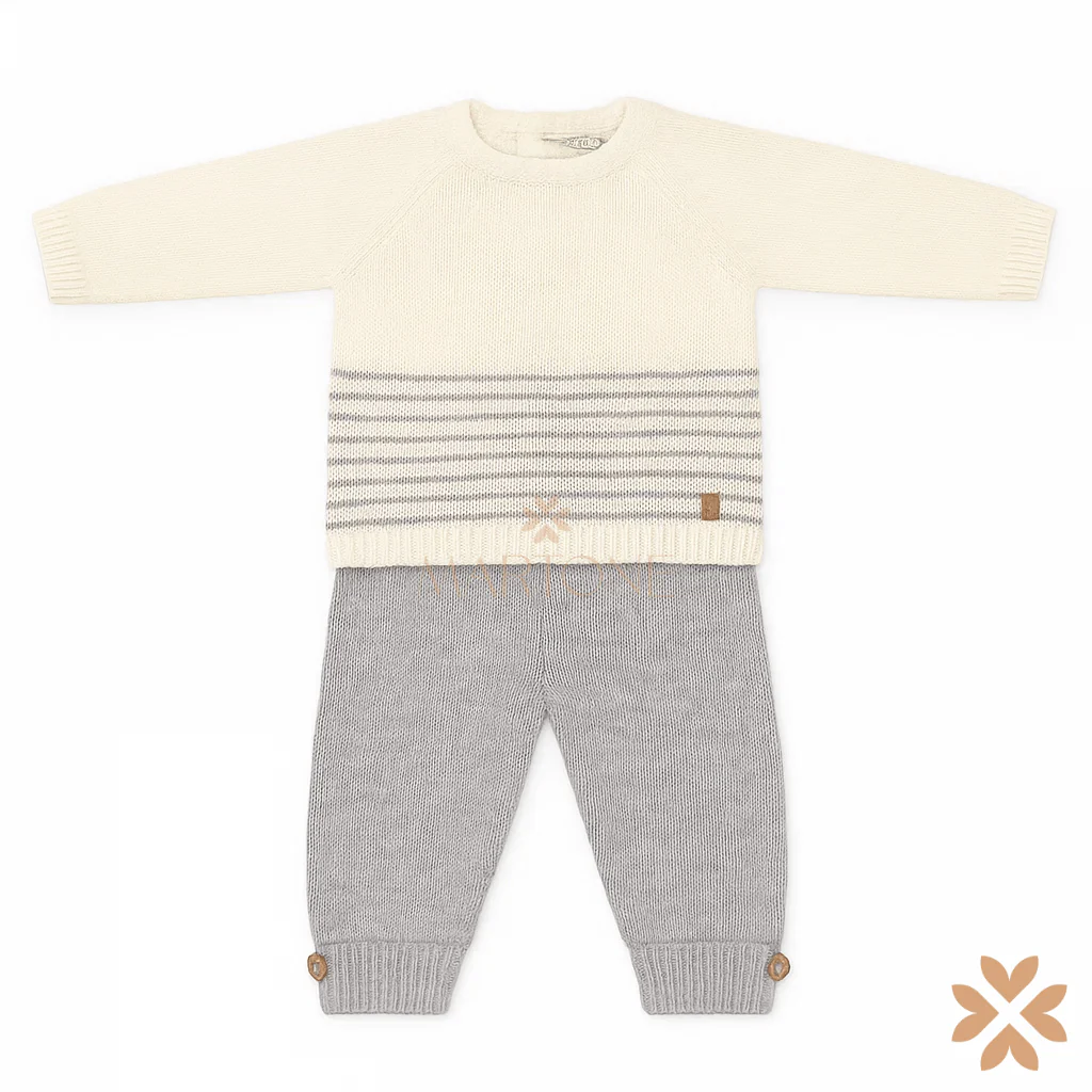 Tutina spezzata in maglia con maglia panna a maniche lunghe, rifinita con motivo a righe grigie sul fondo, abbinata a pantalone grigio con risvolto al fondo ed elastico in vita.