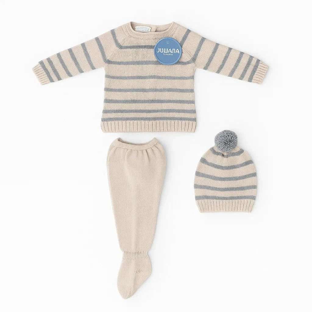 Tutina spezzata in lana con ghettine e cappellino coordinato, fantasia a righe crema e grigio, morbida e calda.