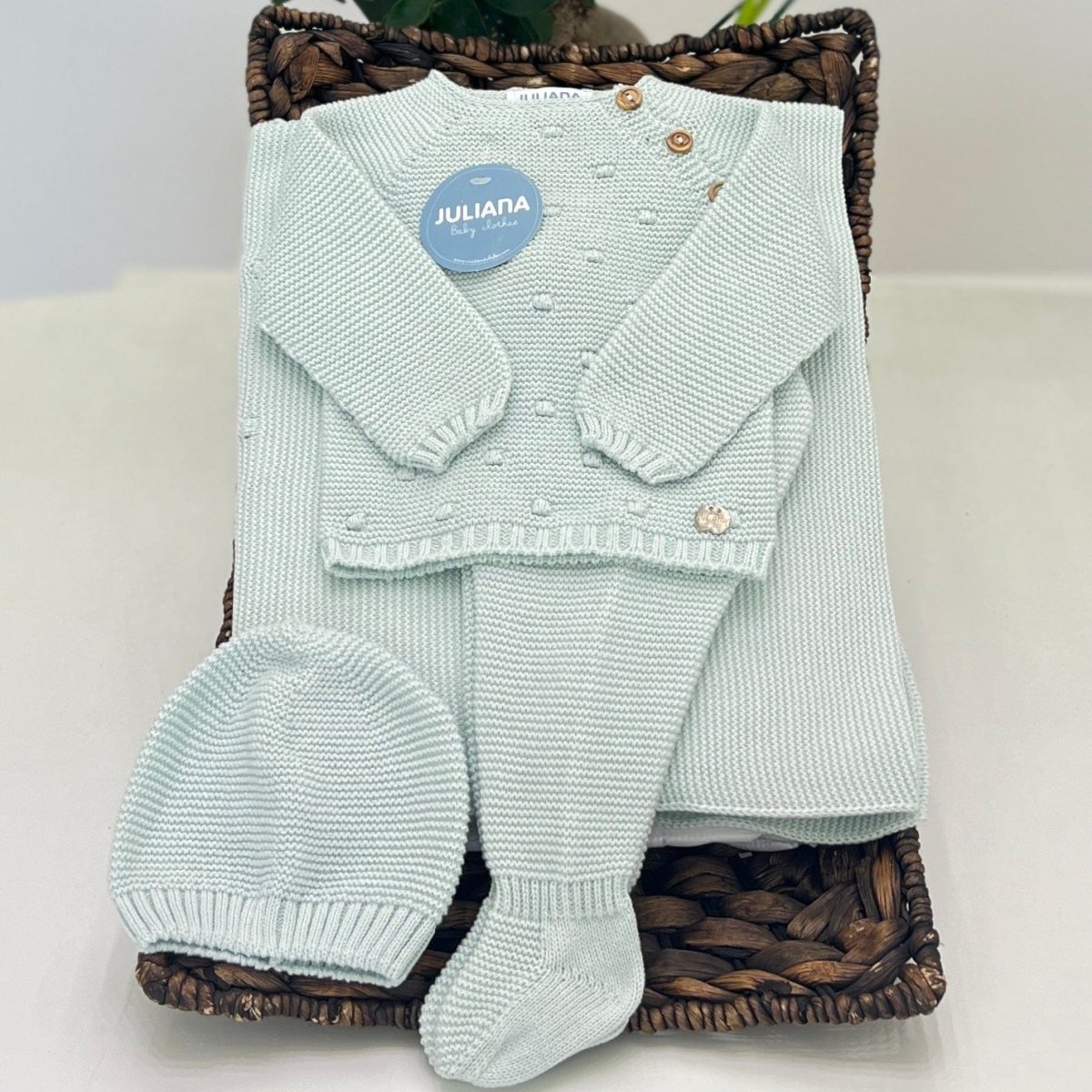 Tutina spezzata con ghettine in filo di cotone, con nodini ricamati e bottoncini laterali, cappellino coordinato.