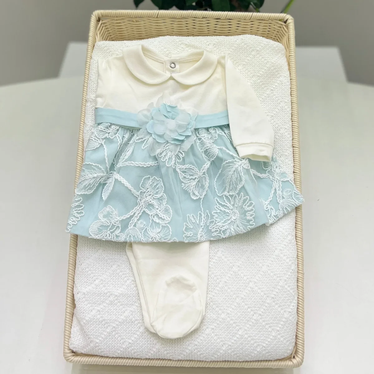 Tutina spezzata per neonata in cotone, morbida e confortevole. La balza in pizzo rebrodé aggiunge un tocco raffinato, mentre il dettaglio floreale completa l’insieme con eleganza. Perfetta per un’occasione speciale.