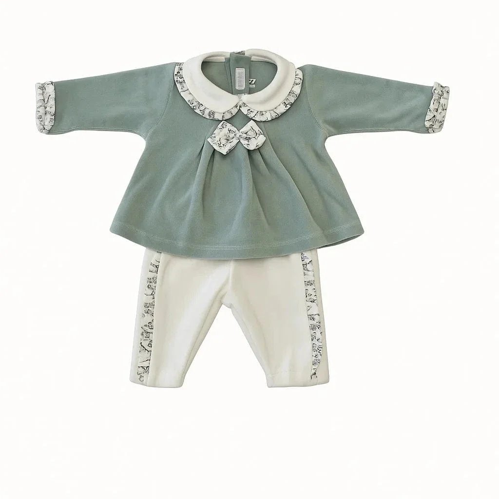 Tutina spezzata in ciniglia per neonata, con corpetto decorato da inserti floreali e orsetto in peluche ricamato. Pantalone a contrasto bianco con fascia in vita elasticata e chiusura con bottoni a pressione sul retro.