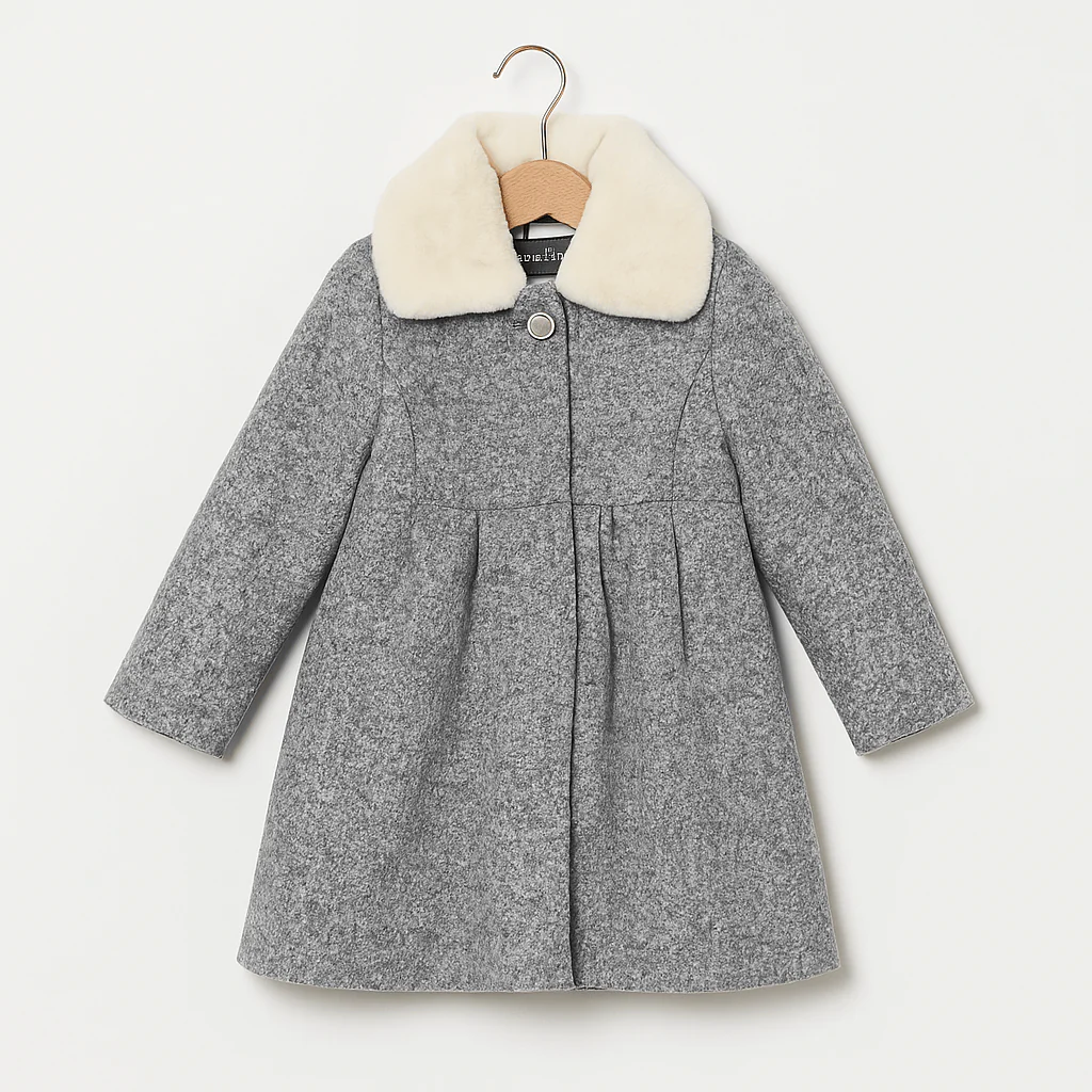 Cappottino grigio in tessuto effetto lana, caratterizzato da una linea svasata con pieghe che conferiscono eleganza e movimento. Il colletto in morbida pelliccia ecologica color panna aggiunge un tocco sofisticato e delicato. Chiusura frontale con bottone singolo a vista. Un modello caldo, raffinato e perfetto per le occasioni speciali della stagione fredda.