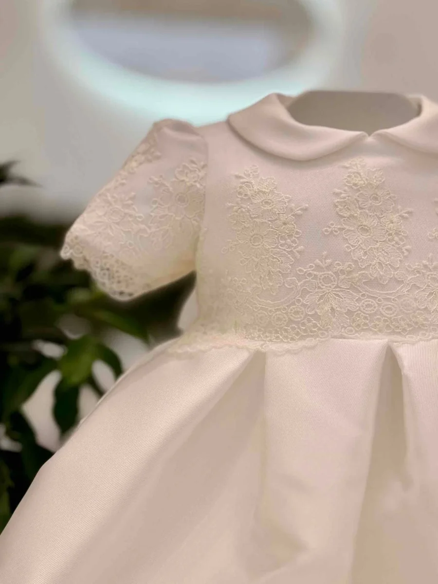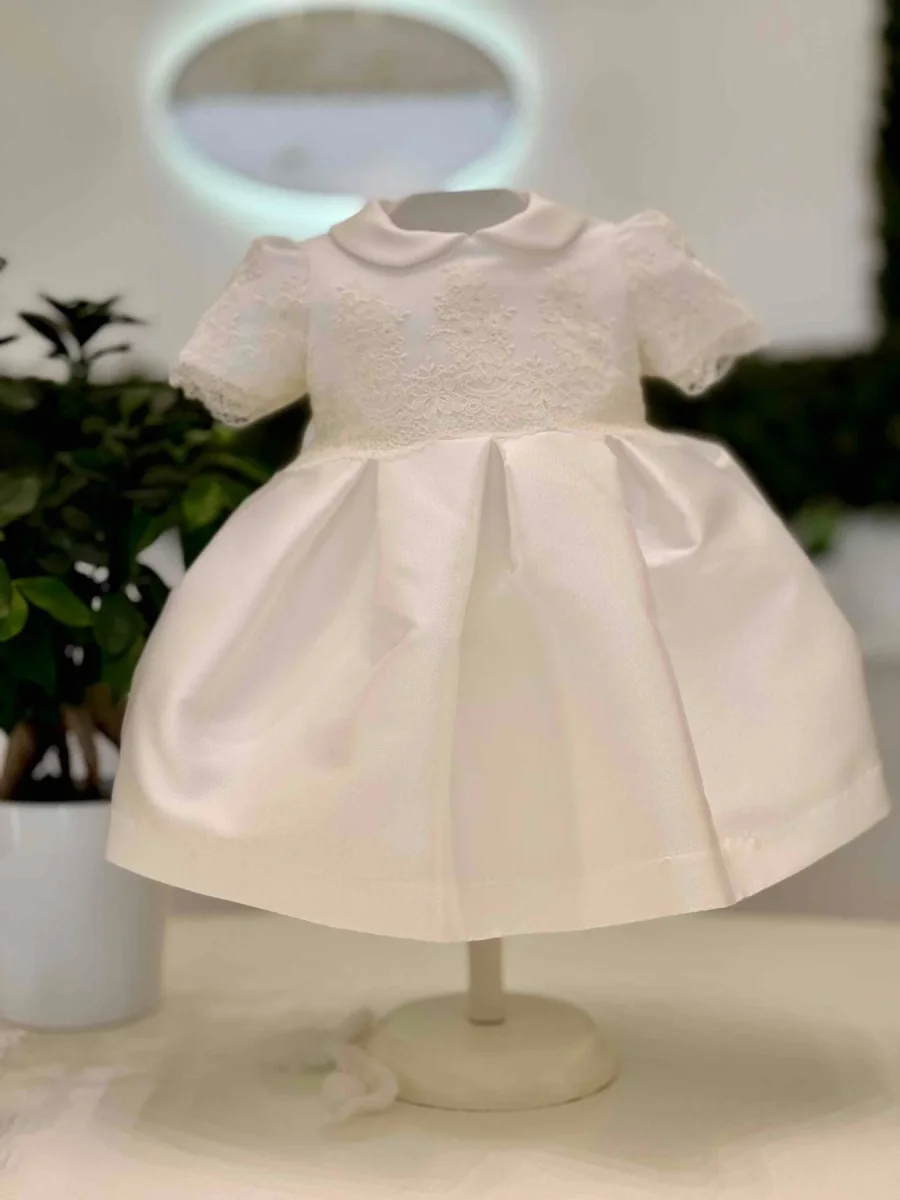 Abito battesimale di mikado con corpetto in pizzo manica corta
