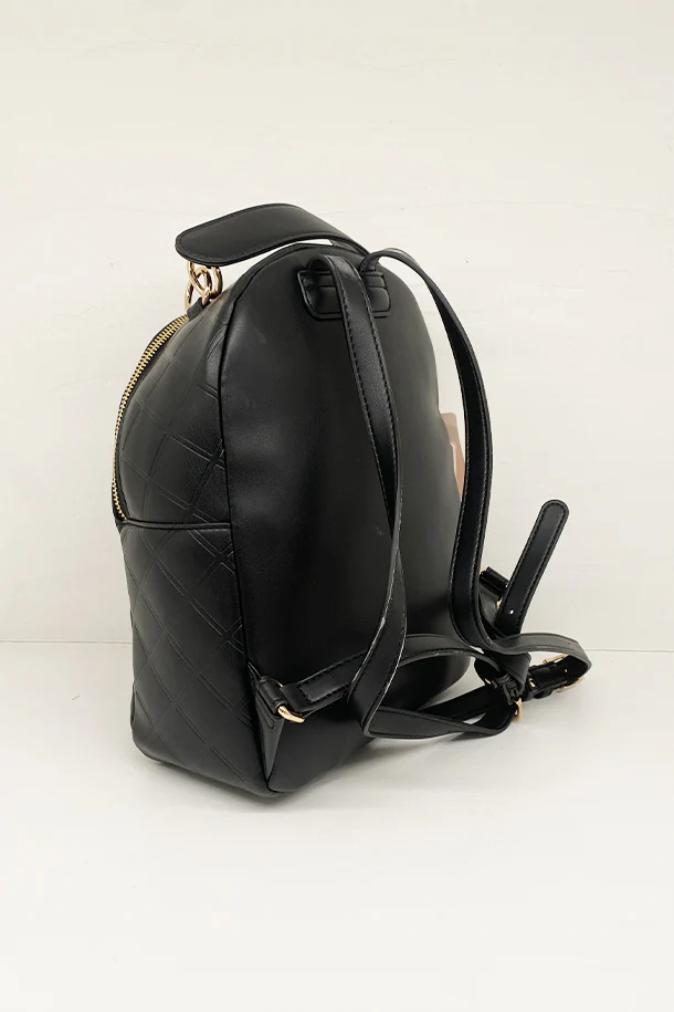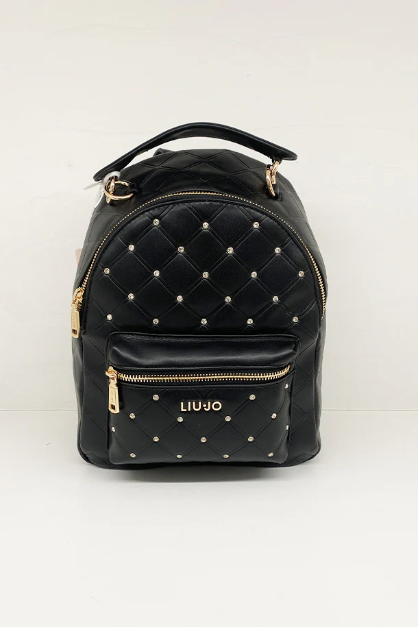 Zaino in eco pelle trapuntata solid color con borchie brillanti, logo e zip metalliche, multi scomparto, spallacci regolabili, interno foderato con scomparti