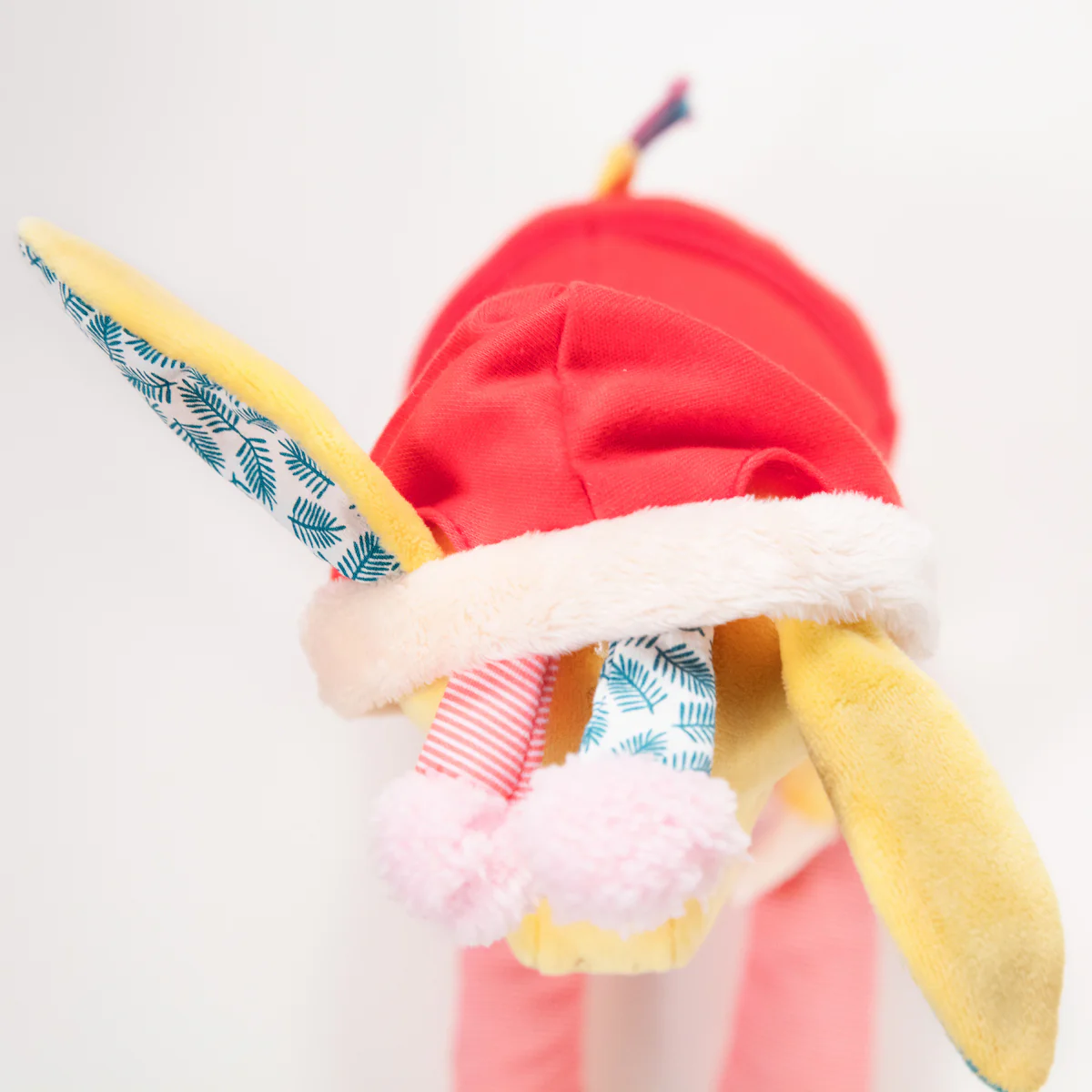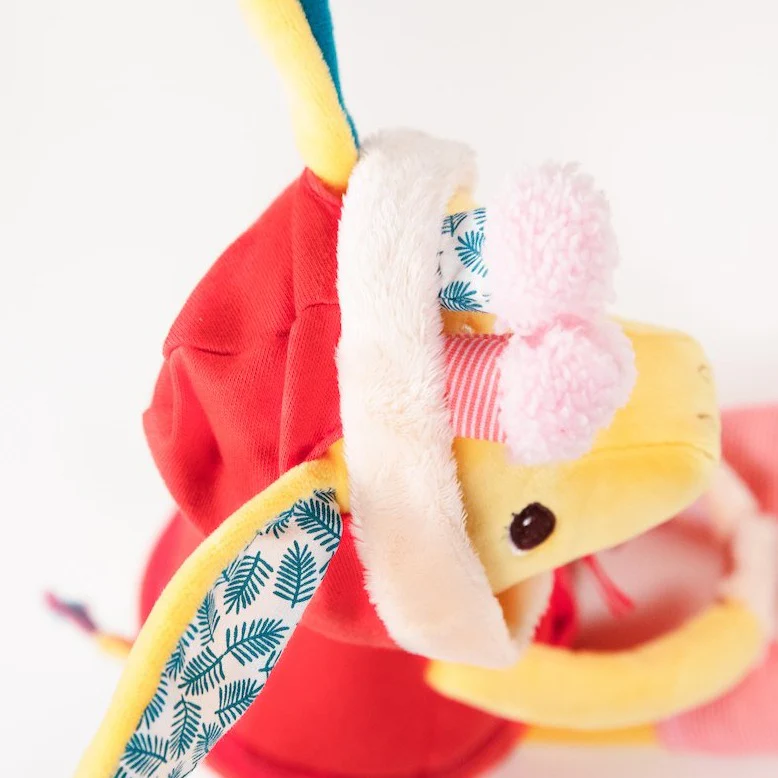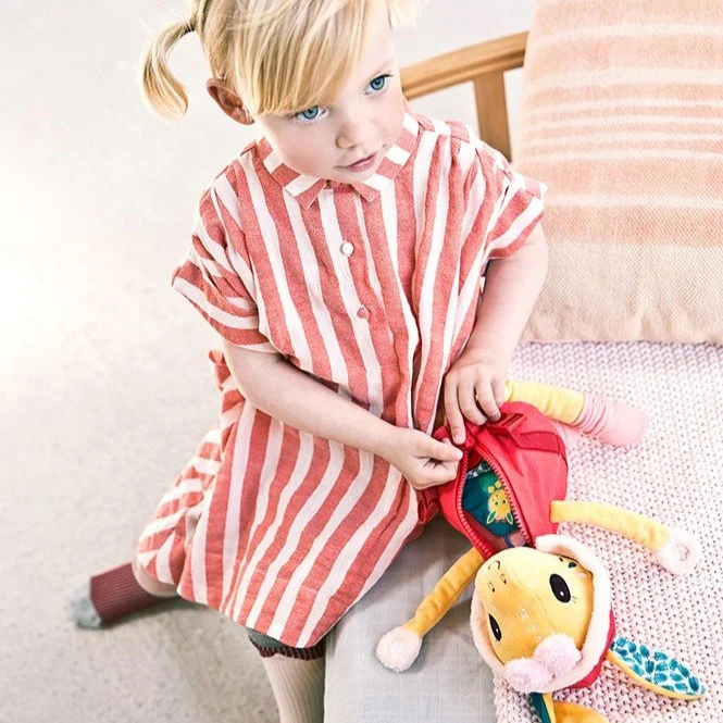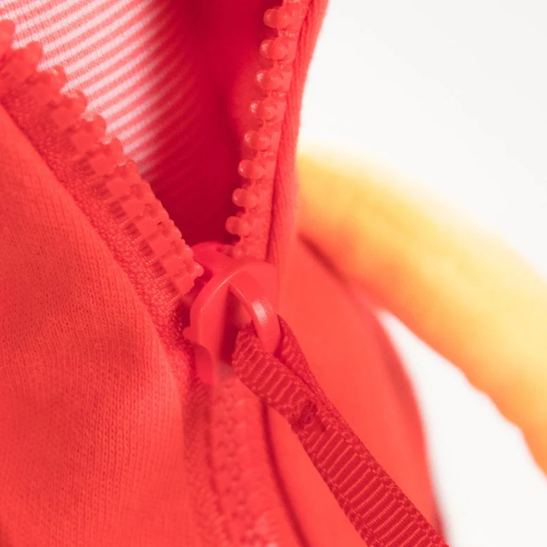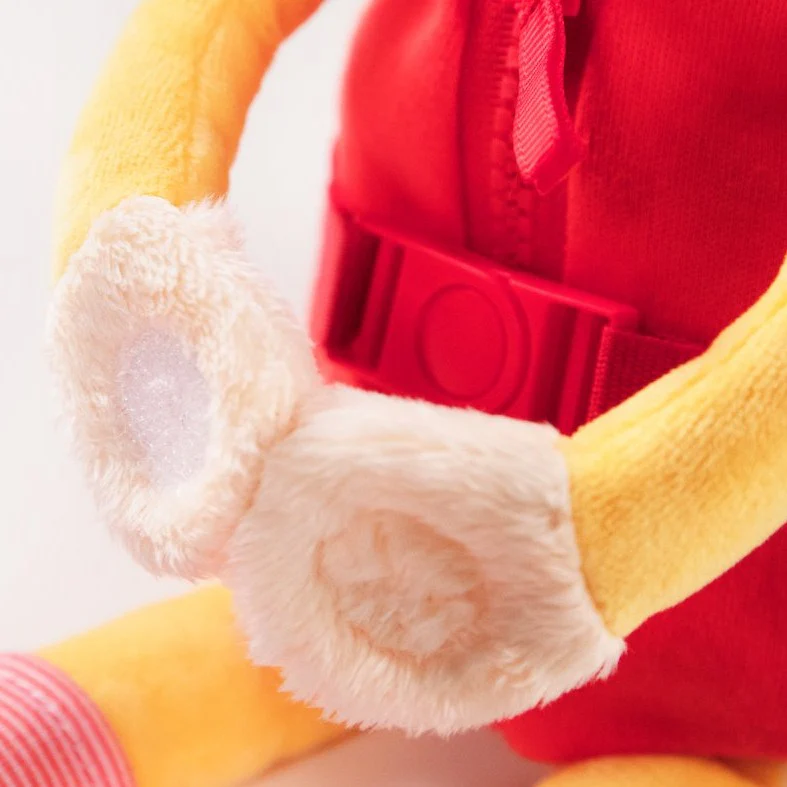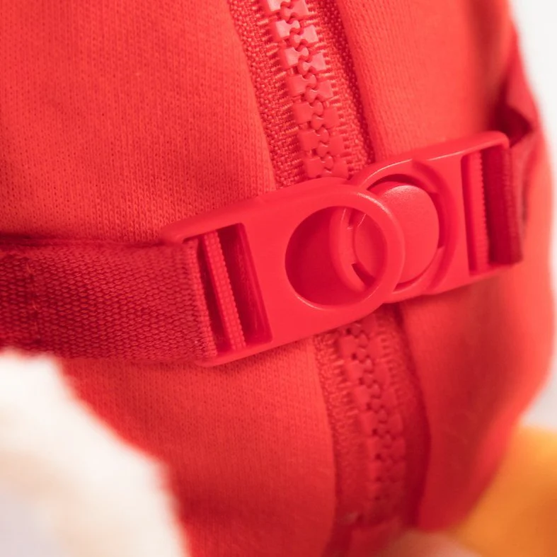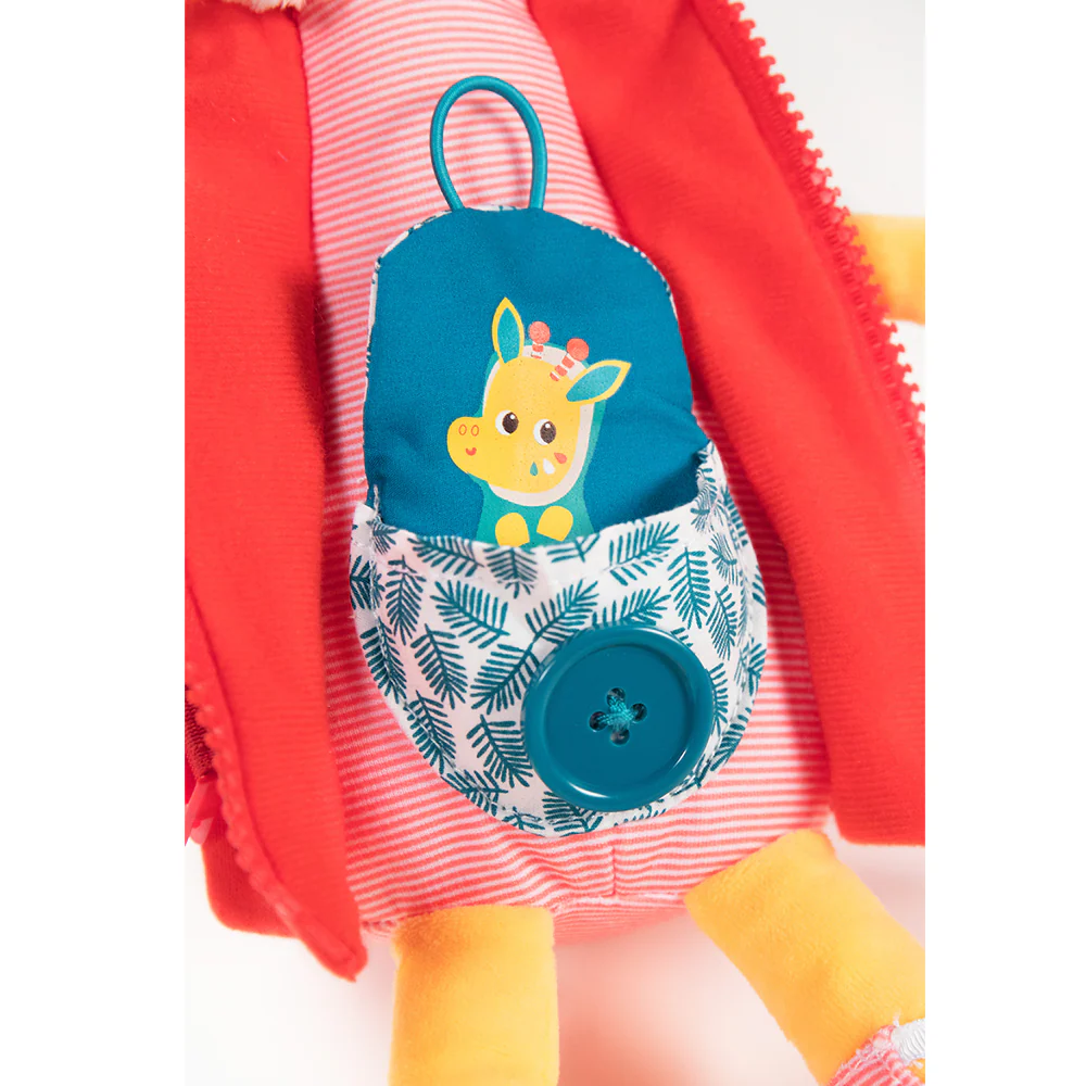 Apri la giacca con la cerniera, fai esercizio con la cintura a scatto e annoda i nastri delle calze. Le orecchie di Zia entrano nei fori del cappuccio e c’è un bambino dietro la sezione con un bottone sulla pancia. Stimola le capacità motorie fini ed è un’introduzione al vestirsi e svestirsi.